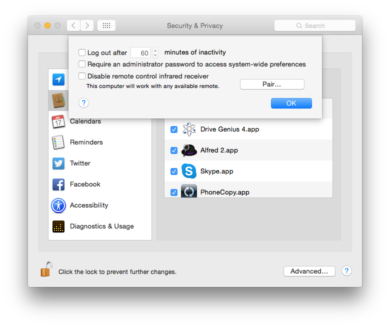 - Advanced – don’t forget to click on this button for extras that Apple has tucked away; set automatic log out if you may be away from a desk to which others have access; disable infra-red remote controllers if there is any chance they might be used by others.