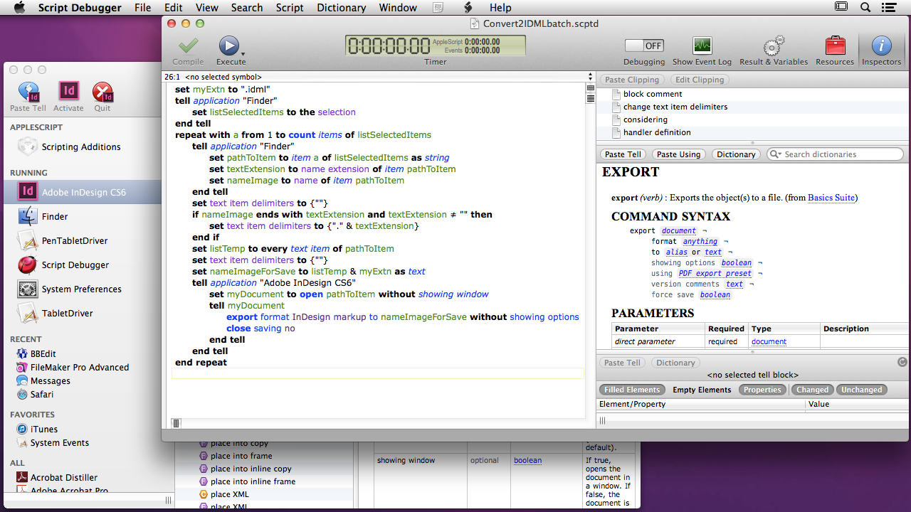 AppleScript remains an excellent choice of scripting language, with many surprisingly elegant and concise features. However Apple’s free vanilla script editor is not suited to this type of development: the error-handling and debugging facilities of Script Debugger make it an essential investment if you want to do anything beyond the most trivial.
