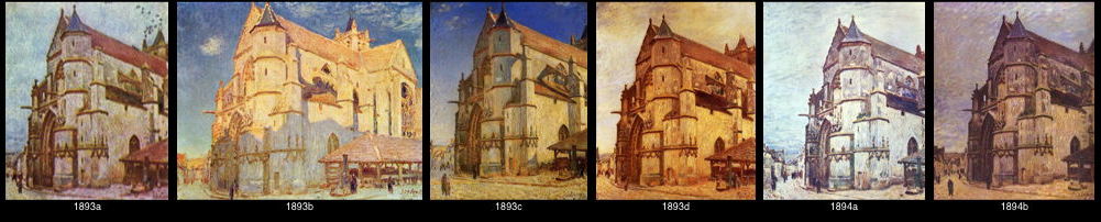 Currently it is very difficult to study Sisley’s series in any greater depth, because his work and little remaining correspondence are hard to access, and there has been no biography published. However indications are that Sisley gradually assembled series of paintings as a result of his working process, until he deliberately set out to paint his tight series of the Church at Moret-sur-Loing in the knowledge of Monet’s commercial success.