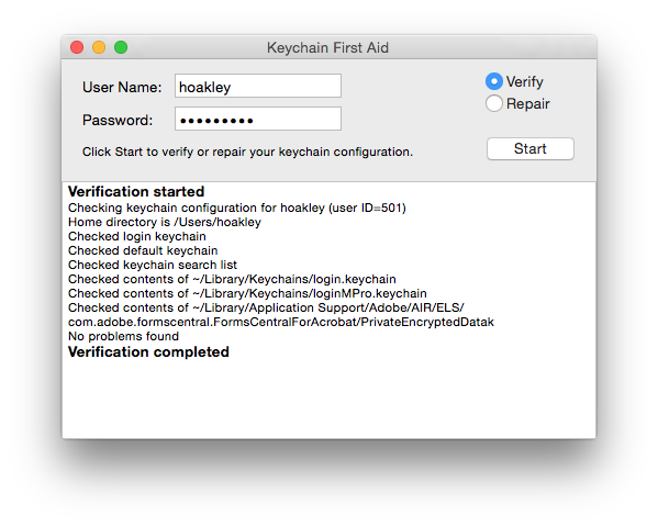 Keychain First Aid used to be a separate utility, but the ability to check the integrity of a keychain and repair it if necessary has now been rolled into the single application, accessed through its entry in the Keychain Access menu. You can also use its padlock icon to lock your keychain immediately, and preference settings to force automatic locking, for additional security.