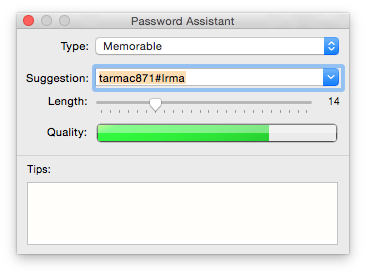 Passwords can be suggested according to several different criteria, of which the most useful is generally the Memorable option. Try to make their length 12 characters or more, and never use any password that is shorter than eight.