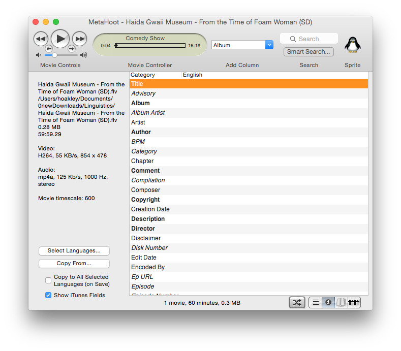 Once you have a Flash or other movie in QuickTime form, you need to discover the compression formats used and other details. An excellent free tool for that, far superior to Apple’s now severely stunted QuickTime Player application, is the free Metadata Hootenanny, alias MetaHoot. This has greater capabilities and features, as it allows you to edit the metadata stored in each movie, which can be put to good use when building a movie library and accessing it from iOS devices.