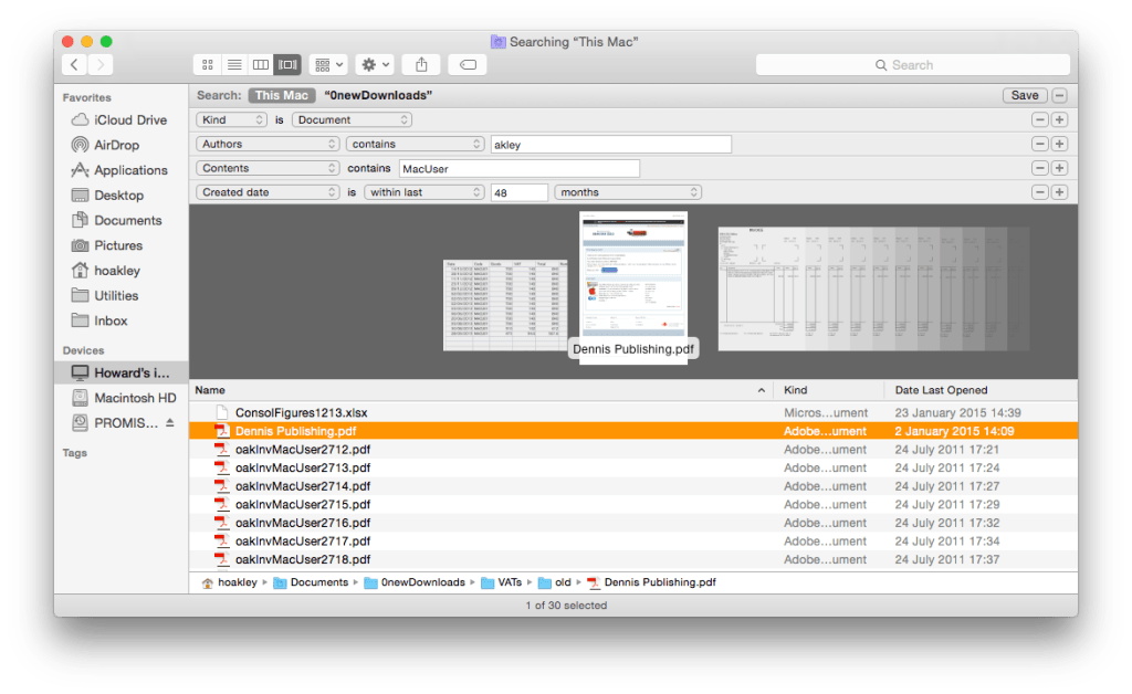 For instance you could set your search to look for files whose Authors metadata includes the string ‘MacUser’, and whose text content includes ‘Spotlight’. This is the best technique for searching metadata fields attached to non-textual documents such as images and movies, which do not otherwise appear in hits from Spotlight searches run from the menu bar tool. You can also include Finder tags in searches using the same mechanism.