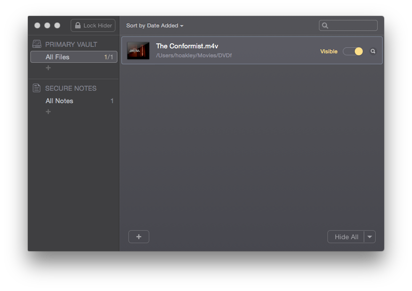 Another approach is that used by Hider 2, £14.99 from the Mac App Store, which can encrypt, hide, and password protect files and folders, but does so by locking them away in its vault.