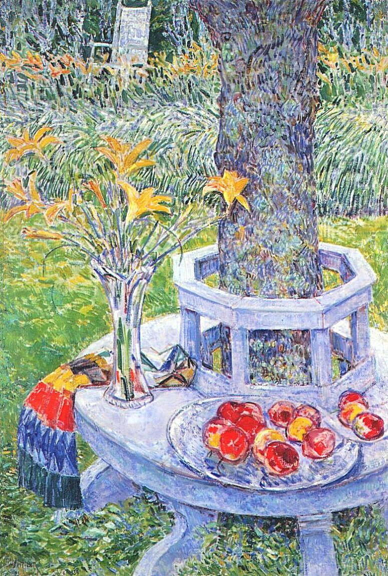 During the 1890s he showed the influence of post-impressionism and sometimes even early Fauvism, but continued in his uniquely impressionist style. He became close friends with J Alden Weir, John Henry Twachtman, and Theodore Robinson. These four American Impressionists maintained contact with Monet. He spent summers painting plein air in locations such as the artists’ colony on Appledore Island, in the Isle of Shoals, New Hampshire. He also visited Gloucester, MA, and coastal parts of Connecticut.