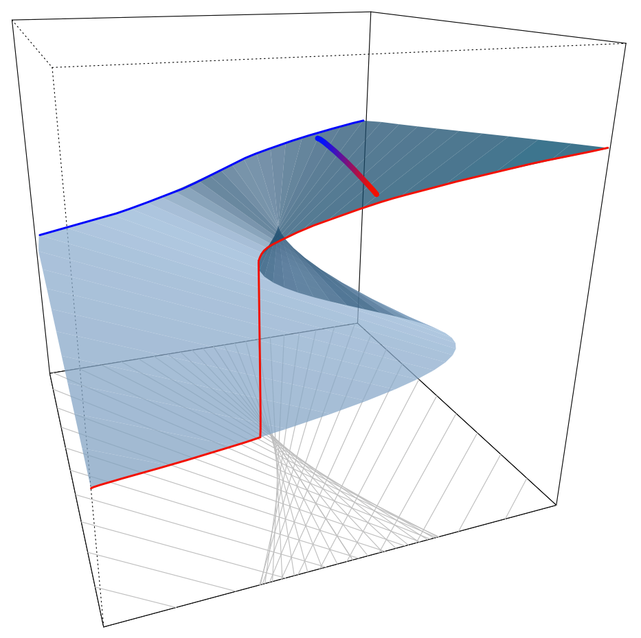 A non-viral event might follow the path represented by the blue line, starting at the top (back) of the surface. As the message spreads, the state moves steadily down the far edge of the surface to a new point. A viral event might follow the path represented by the red line, closest to the viewer. Starting at the top (right), the state reaches the lip and there is a sudden change in state, a catastrophe, which is the viral event.