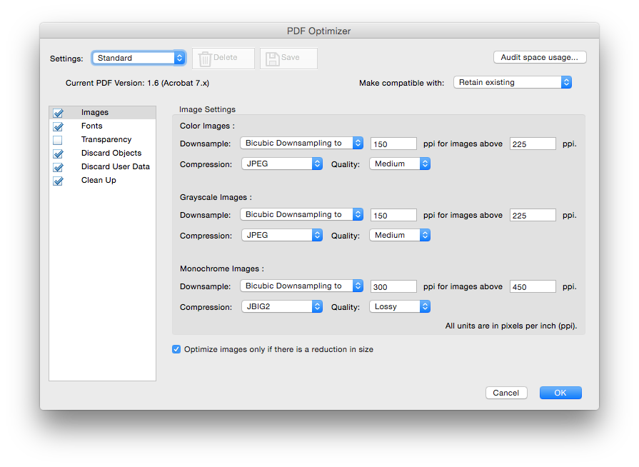 The original print house may be able to do this, or you could use a dedicated tool such as PDFCompress. Paid-for versions of Adobe Acrobat, such as the latest Acrobat 2015 DC, also include this as a standard feature, but are more costly and offer much more. If you have a Pro release of Acrobat, open the document and then use the Save as Other… entry in the File menu, for its Optimized PDF… command, tweaking the compression settings until you strike the right balance between file size and image quality.