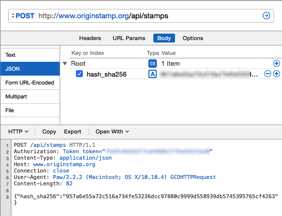 The first step before you can start using OriginStamp’s API is to obtain a key, which will be good for a million stamps. Do this in the Setup section of the API Documentation. Copy and save the SHA-256 digest which it provides, as you will need to supply that authorisation token when you use the RESTful interface. In the code below, I will substitute a string of a characters for my token.
