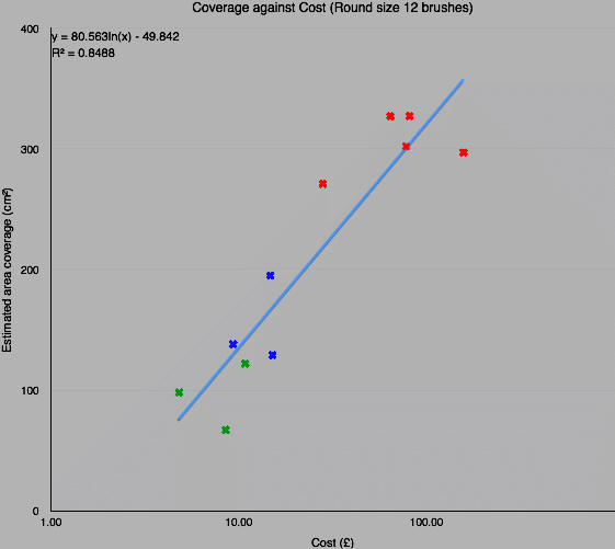 The graph above shows capacity against cost, with sables marked in red, mixed fibres in blue, and synthetics in green. The graph below shows the same data, but this time with the cost scale logarithmic, and gives a good indication that cost increases disproportionately with capacity: the more that you pay, the less the increase in capacity. This is the ‘law of diminishing returns’ in action.