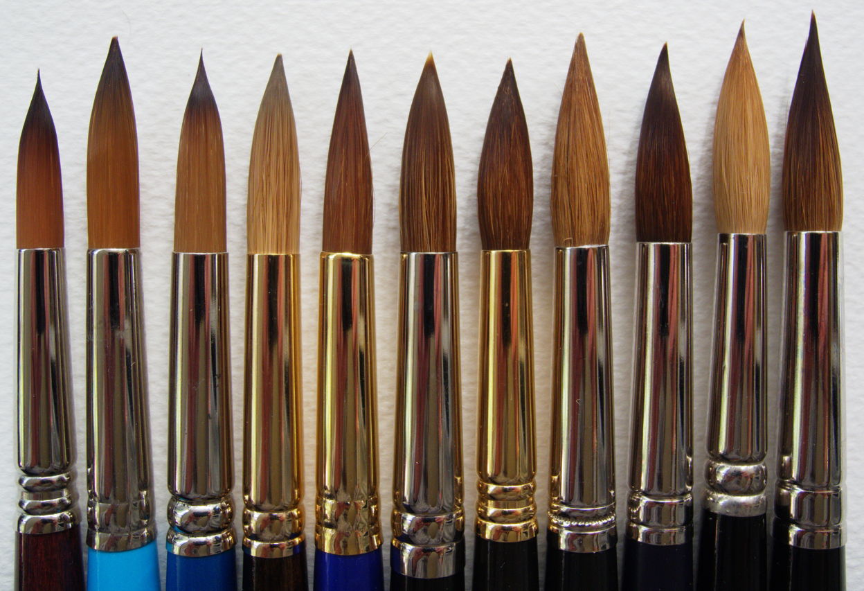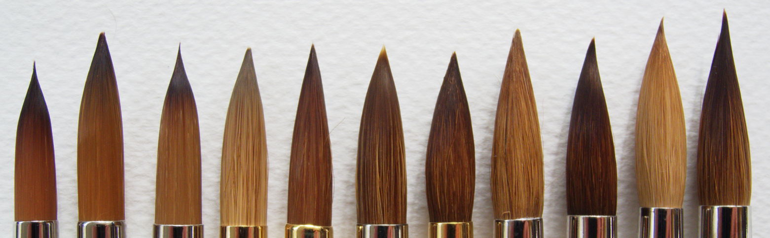 I have, as before, included one brush which is nominally a size 10, not 12: the Winsor & Newton Series 7 sable. As you will see, it is comparable in size and performance to the other size 12 brushes, and more expensive than any of the others. Thus of the eleven brushes tested, five are made from sable hair (actually Siberian weasel, a common and widespread species), three from synthetic fibres alone, and three contain a mixture of sable and synthetic.