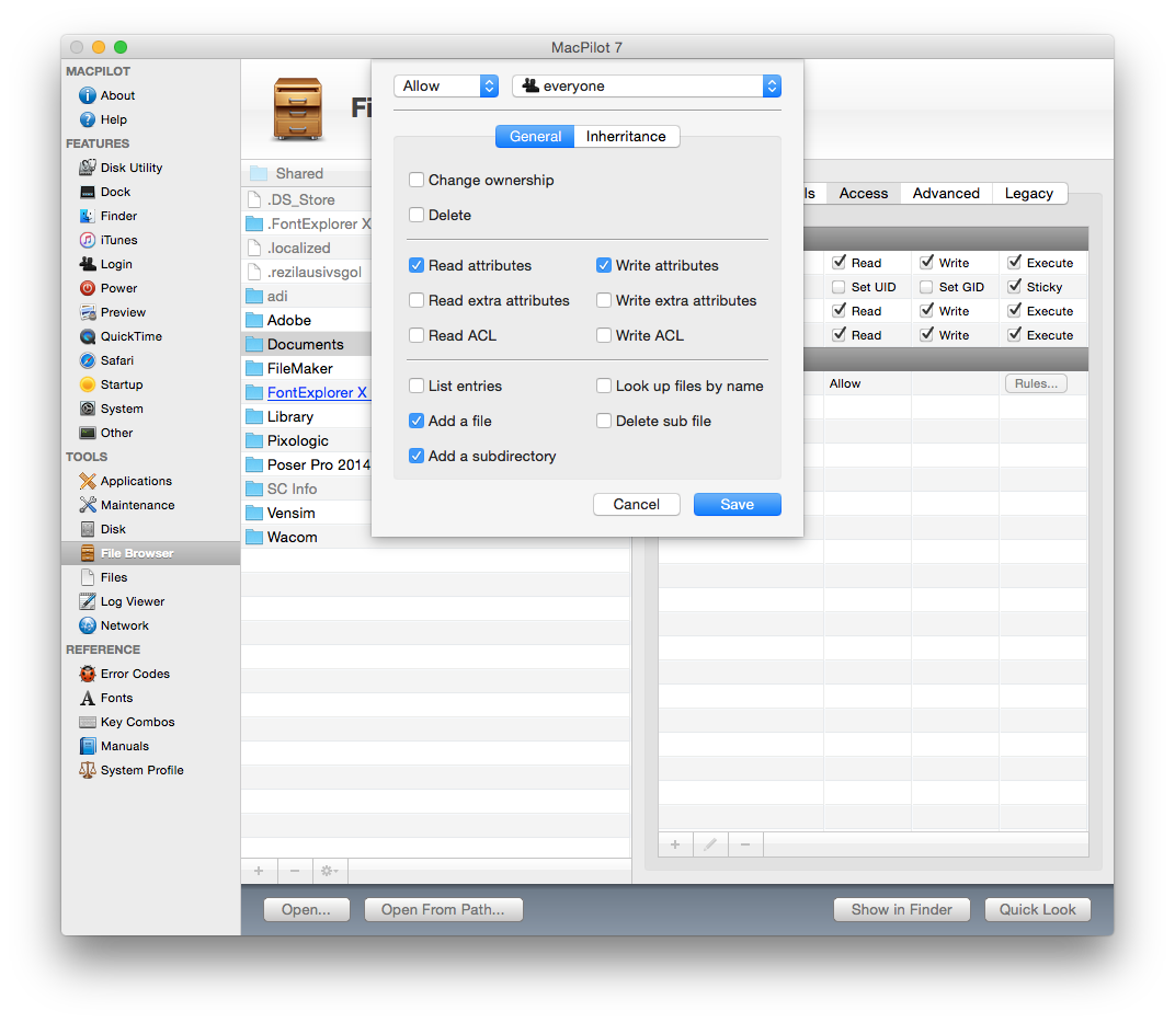 1. Add ACLs. Select the File Browser tool, and navigate until the folder you wish to change is selected in the left pane. Then select the Access tab in the right pane. Click on the + tool to add ACLs, which drops a sheet down to allow you to set them. In the top pop-up menus, select Allow (left) everyone (right), and in the General tab below select at least Read attributes, Write attributes, Add a file, and Add a subdirectory.