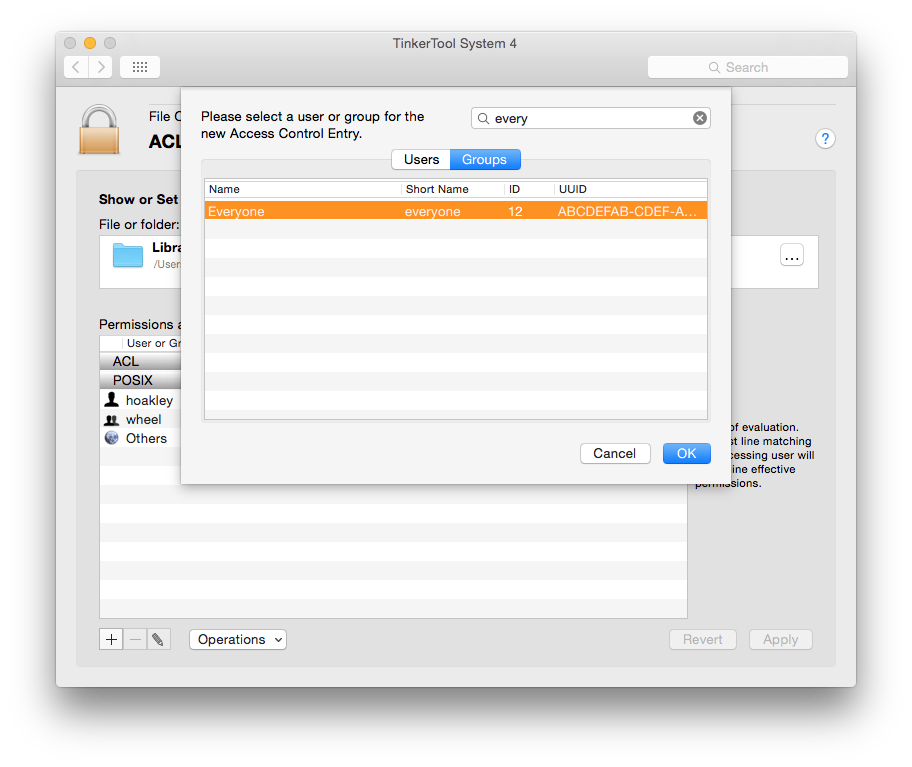 1. Add ACLs. Select the ACL Permissions tool, then drag and drop a folder, such as one in your Shared Folder, to the top selector, or click on the … tool to choose one. Click on the + tool to add permissions, then select the Groups tab. Locate (using the Search box if necessary) the Everyone group, which should have an ID of 12.