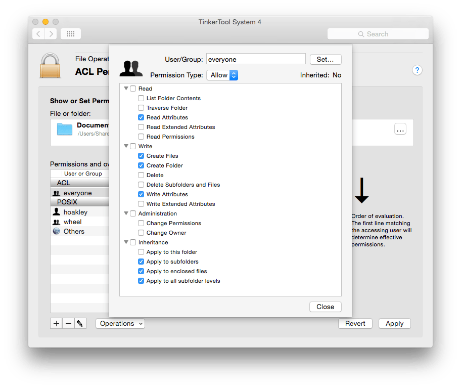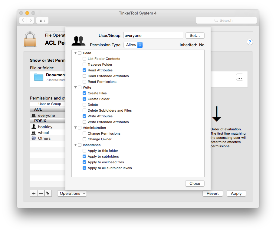 2. Set ACLs. Double-click the row entry for Everyone which you have just added to the ACL section of the pane to view the complete listing of the settings. You can now customise ACLs that define actions that are allowed, and those that are denied, for each user and group. This provides almost infinite variations in access and control that could become bewildering. In this case, as a minimum, set the folder to Read Attributes, Create Files, Create Folder, Write Attributes, and in Inheritance Apply to subfolder, to enclosed files, and to all subfolder levels. Then click the Close button, and then Apply the changed ACLs.