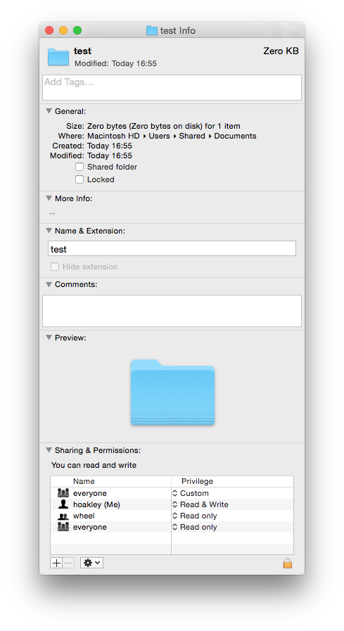 3. Test. There is no equivalent of the Effective Permissions tab in TinkerTool System, so select the folder in the Finder, and inspect it in the Get Info dialog (Cmd-I), to ensure that the everyone group is listed as having Custom privileges. Try creating a folder and file inside it, and check their permissions.