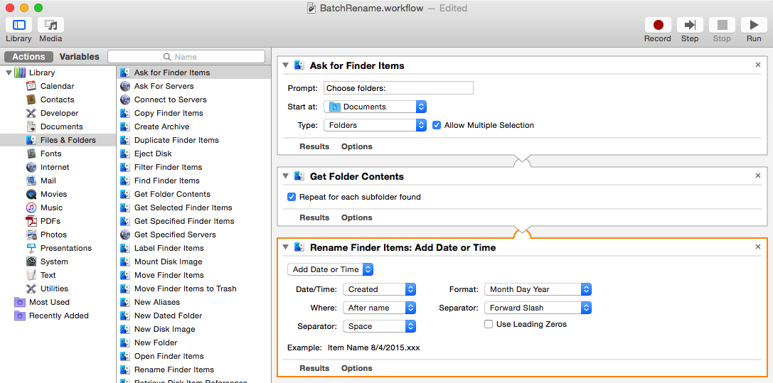 3. Add rename action. In most cases, you will want to rename files contained in sub-folders within the chosen folders, so check the box to repeat for sub-folders. Locate the Rename Finder Items action, drag and drop it to your workflow. You will then see an alert offering to add a Copy Items action: click on the Don’t Add button so that copies are not created. If you inadvertently end up with a Copy Items action, remove it by clicking its close box.
