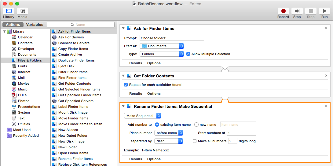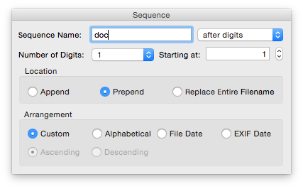 4. Select renaming scheme. The Rename Finder Items action contains several quite different renaming schemes, controlled by its uppermost popup menu, each offering quite different settings. For instance, to add a serial number to each image in a sequence, select the Make Sequential item and you can configure in detail how the names will be constructed. You might need to set these to conform to the naming conventions needed to turn a time-lapse photo sequence into a QuickTime movie.