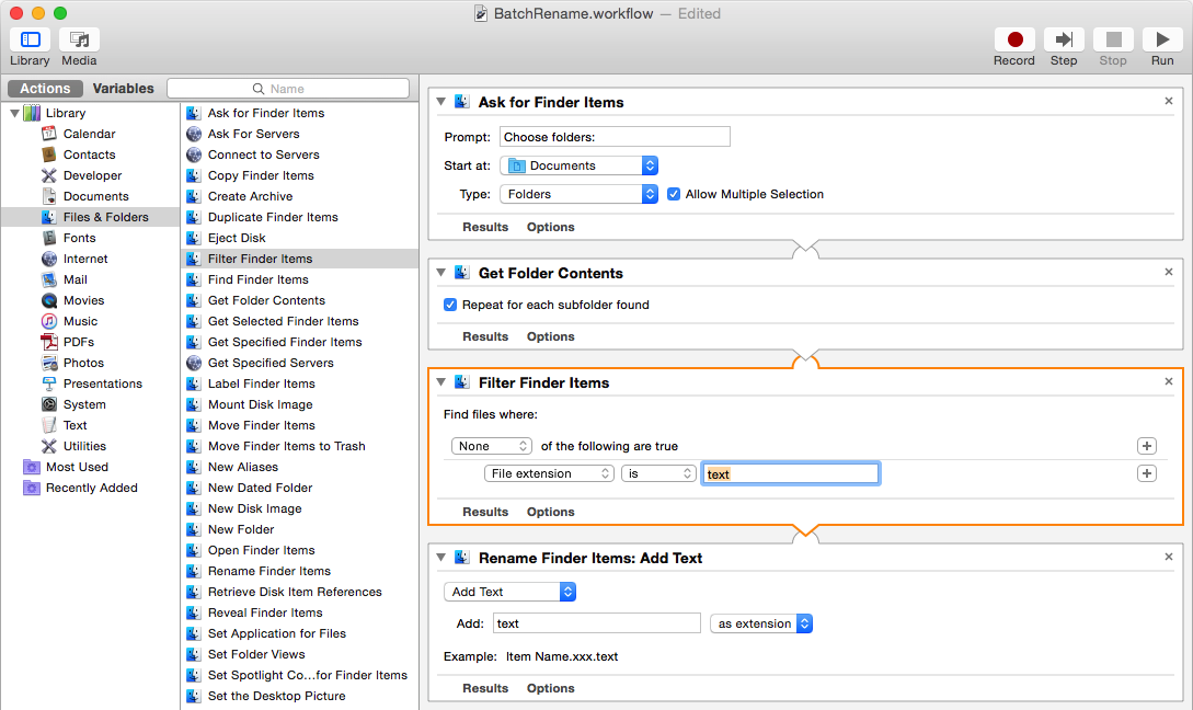 6. Filter file input. One problem with adding an extension in this way is that some file names may already have extensions, which might not be of the type that you wish to set other files; for instance an image might already have .jpg or .jpeg appended to it. To cope with this, drag and drop the Filter Finder Items action into your workflow before the renaming action and set its options to exclude files with known extensions and whose kind is not text.