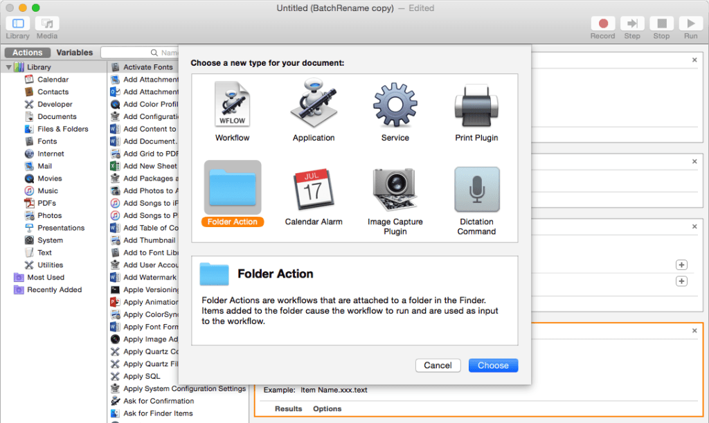 8. Make a folder action (optional). Instead of creating an application, you might find it better to implement this as a folder action. Check you have Folder Actions enabled: in the Finder, Alt-click on a folder, and enable in Services > Folder Actions Setup…. Create a new file with Command-N, as a Folder Action not Workflow. Create a working folder and associate the action in the top popup menu. Copy and paste the Filter Finder Items and Rename Finder Items to that and save with Command-S.