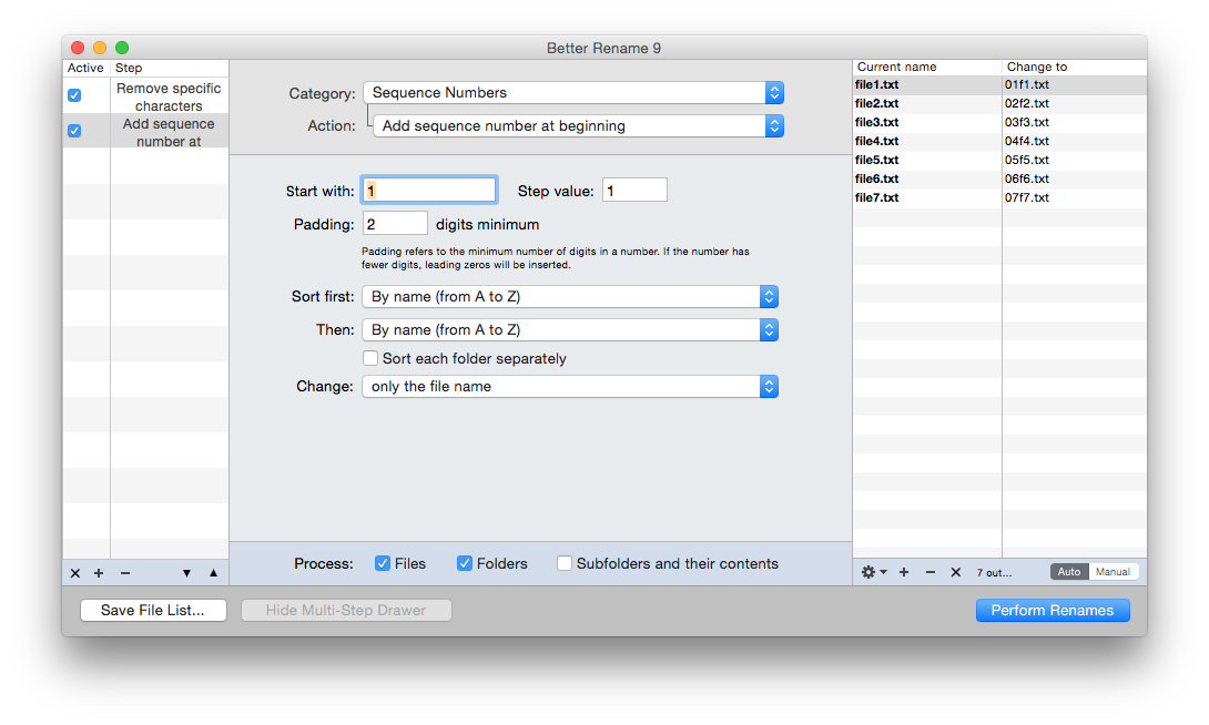 2. Add further actions. Add a further renaming step by clicking on the + tool at the foot of the drawer. Change this second step to Sequence Numbers, adding a sequence number at the beginning, for example. Once you have built the right sequence of steps, check that the names given in the Change to column at the far right are correct. Then click on the Perform Renames button to commit the proposed changes. You can save any given steps as a preset, using the Presets menu.