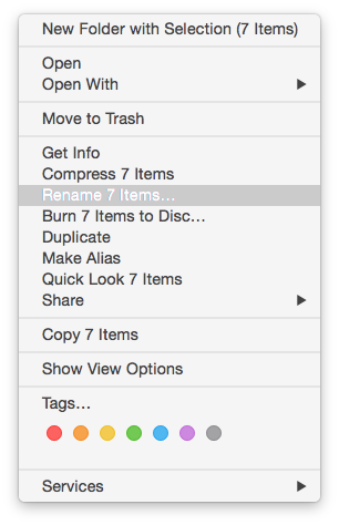 1. Use the contextual menu command. Select all the files that you want to rename, and right-click (or two-finger tap) to bring up the Finder’s contextual menu. In that, select the Rename items… command. This gives you three options for renaming, through its popup menu.