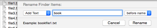 3. Add text. This adds a fixed string of text either before or after the existing file names, but always before the extension. Thus it would be good for changing file1.txt to bookfile1.txt or file1app.txt.