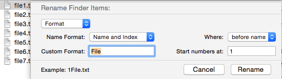 4. Format. This gives a range of options for serialising the names, which can consist of a custom text element, an index or serial number or date, and the existing name. So you might find it ideal for turning bookchapa.txt into 1Filebookchapa.txt, and so on. You can of course apply these renaming rules in sequence, to perform more complex patterns, such as turning bookchapa.txt into 1LordOfTheRings.txt, perhaps.