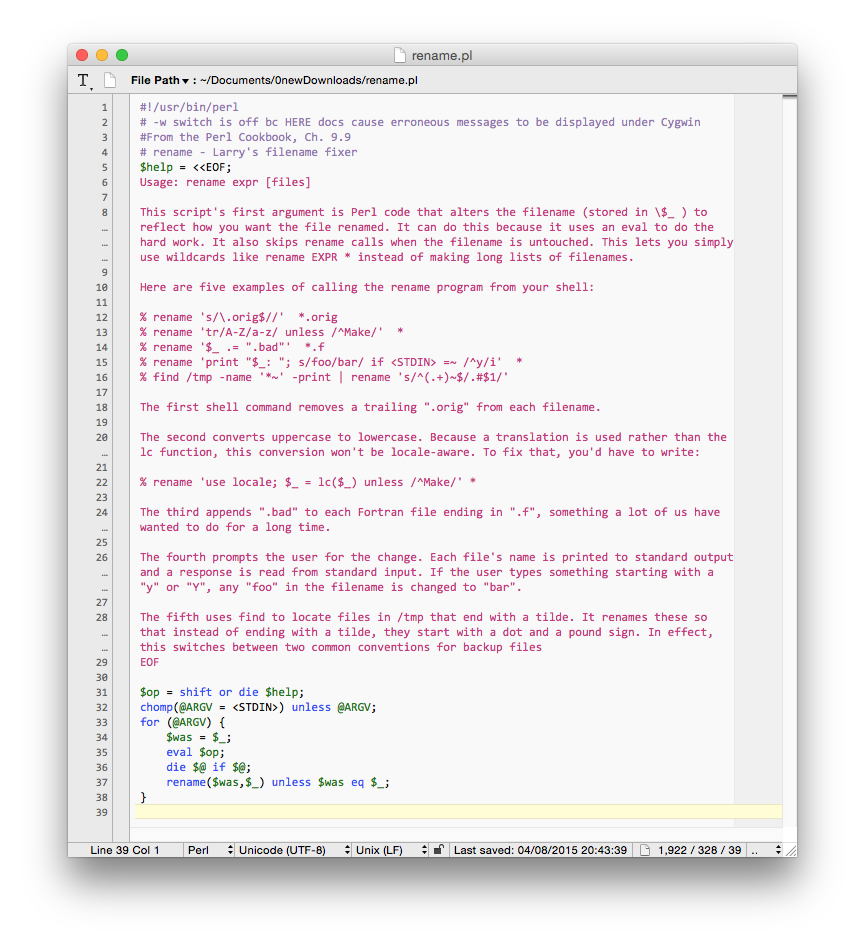 1. Create Perl script. One shortcoming in OS X is that it lacks a built-in rename command. The standard command for changing file names is mv, whose primary purpose is to move files. You will find it much better to install your own Perl script based on Larry Wall’s Filename Fixer, shown here ready to save to a convenient location. Ensure that you make the file executable, for example editing its permissions using MacPilot or a similar tool.