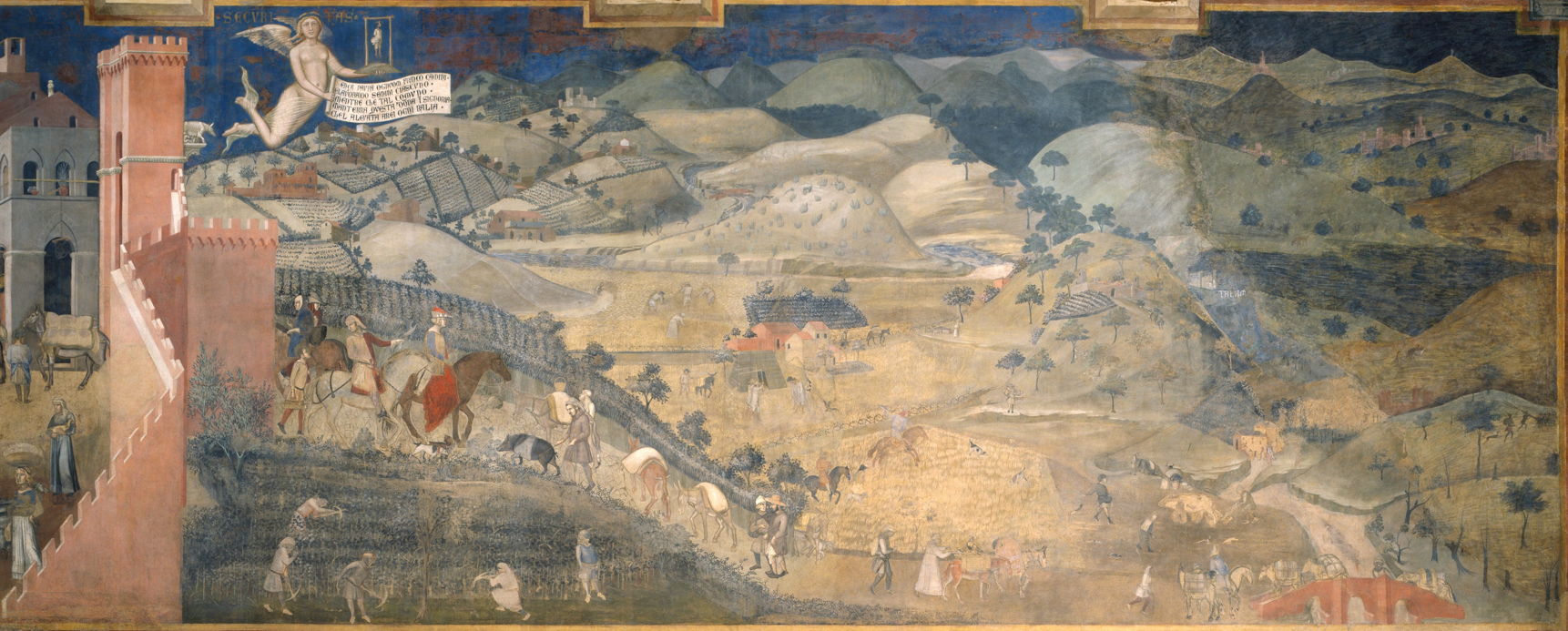 Although here the directory sprawls out over the landscape, the trees, houses, and people are clearly tokens or symbols, and the painting a listing of the benefits expected to result from good government. Its approach to perspective and projection is more uniform, but clearly pre-Renaissance still.
