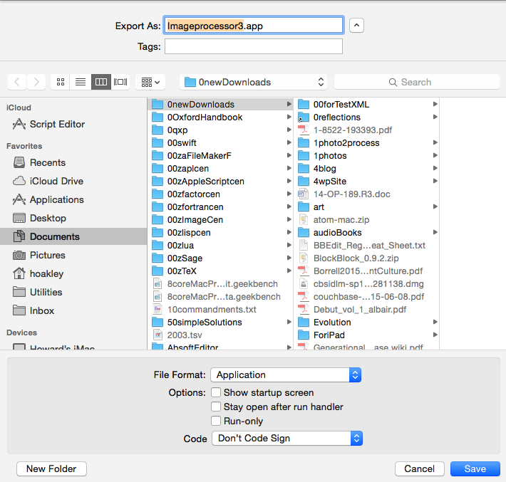10. Complete droplet. Check your droplet’s code through thoroughly to ensure that it is right. It is harder to diagnose and debug problems in droplets than in standard scripts. When you are ready to try the droplet out, use the Export… command in the File menu, and select the File Format as Application, leaving other options set to defaults. Your droplet will then be ready to test.