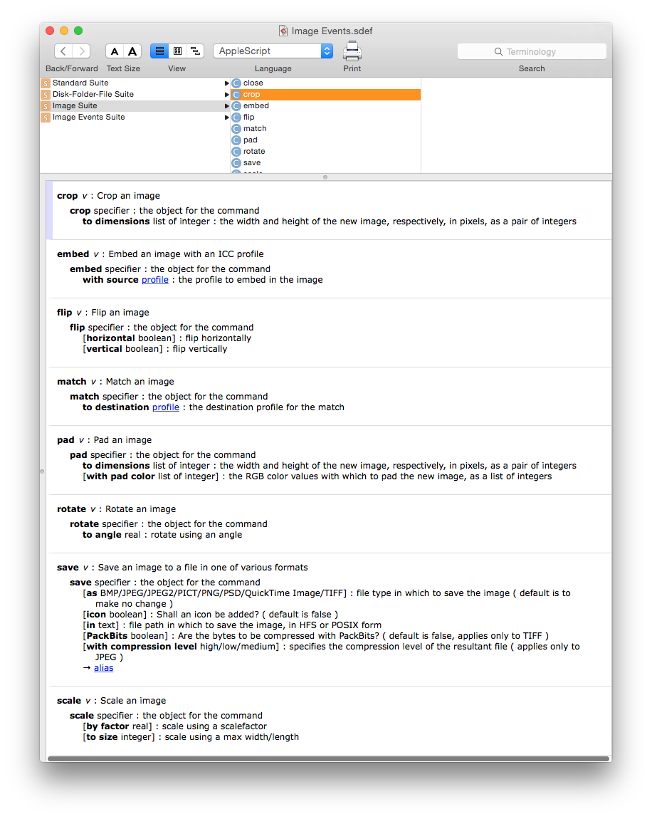 2. Study dictionary. Open the free Script Editor, normally in /Applications/Utilities, and use the Open Dictionary… command in the File menu to browse the AppleScript dictionary for Image Events.app, the interface to OS X’s image processing. Study the Scale and Crop commands that you will use. Note that scale to size uses the longer side as the size argument.