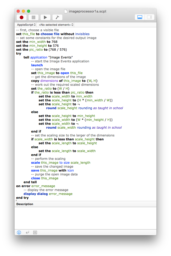 3. Create new script. Open script templates to see how to structure your script. Copy and paste from those, or type the AppleScript source given here, into the editor window. At first write the outer sections of code that choose and open the image, then scale and save it. Until you save or compile the script, it is left in unstructured text format, and its lines are not indented.