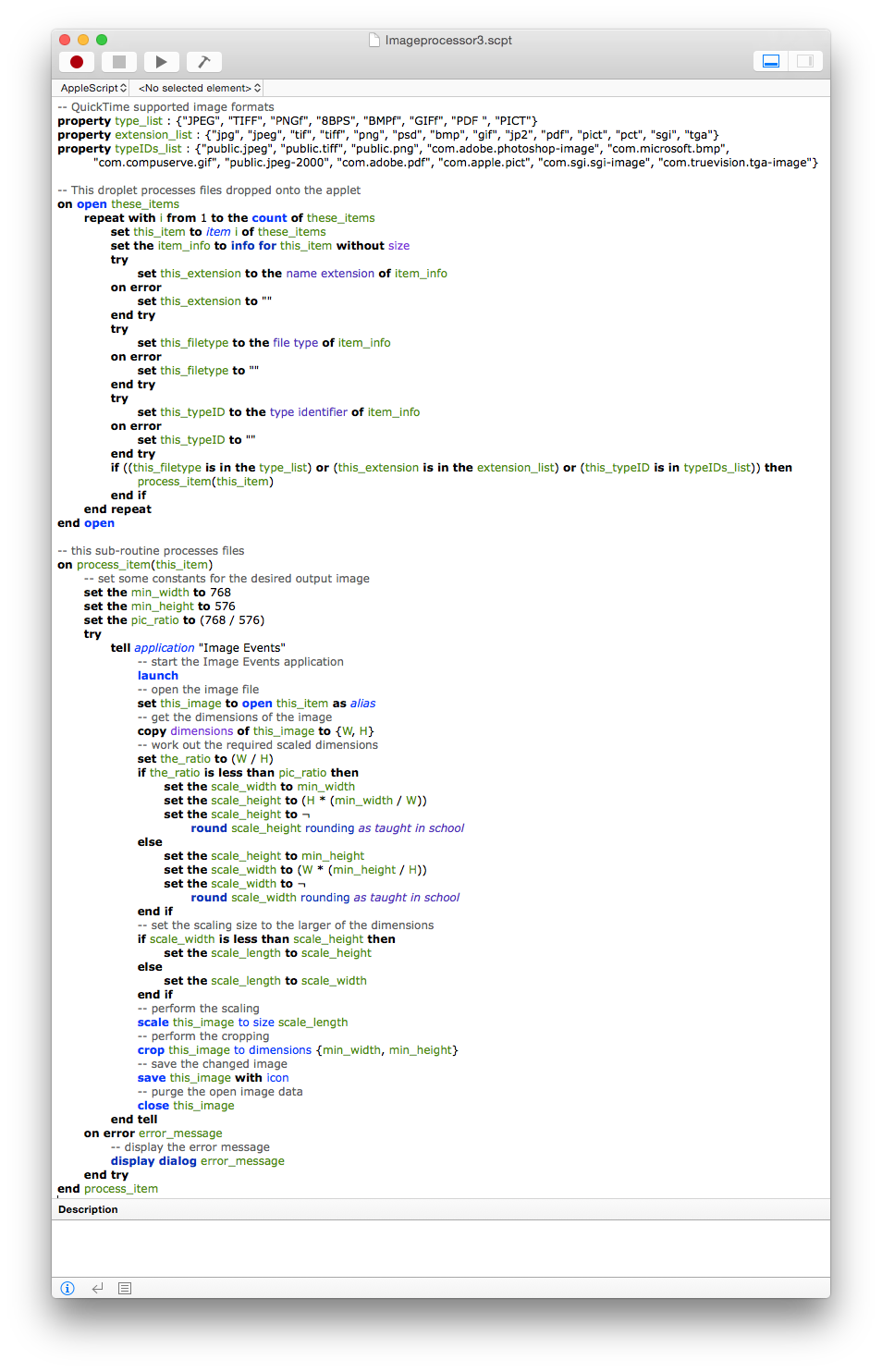 5. Develop second action. Create a second new script, copy and paste in the outer code, omitting the scaling calculations and the scale command. The cropping step is much simpler, as you simply need to specify the dimensions as {768, 576}, here achieved using the same min_width and min_height constants as in your first, sizing script. Save and test this script too. My example script is named imageprocessor1b.scpt.