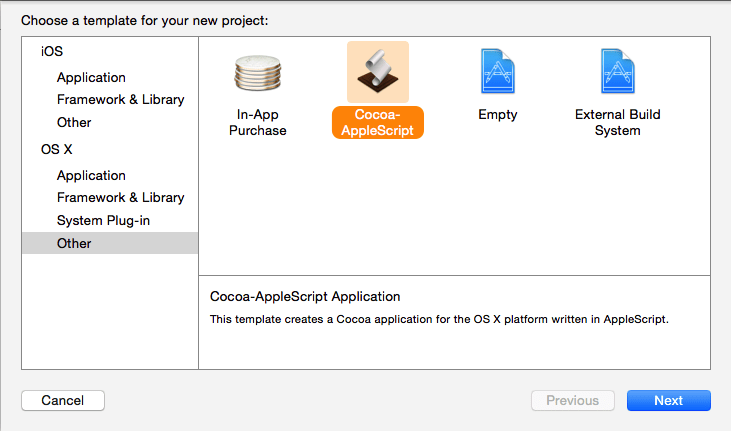 To create a new AppleScript application project, start Xcode, and select the New Project… command in the File menu. In the New Project dialog, select Other in the OS X section. From the options offered in the main view, select the Cocoa-AppleScript icon, then click on the Next button. You will then need to provide a product name and organisation details. Normally AppleScript apps will not be document-based.