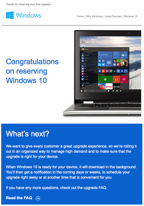 But even now, two weeks after release, all I could do was “reserve Windows 10”. Maybe some time in “the coming days or weeks” it might be ready to download. This is not so much a rollout as a stroll out.