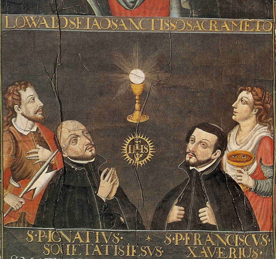 Again by an unknown artist, The Fifteen Mysteries of the Rosary (of which I can show only the lower half) attempted a more complex, but still thoroughly missionary, subject. As with other works which were probably painted in missions, its contents appear to be a pastiche of copies: the woman on the right has a curiously Roman appearance, for instance. The inscription identifies the man on the left as Saint Ignatius of Loyola, co-founder of the Society of Jesus (Jesuits), and the man on the right as Saint Francis Xavier, another of the co-founders.