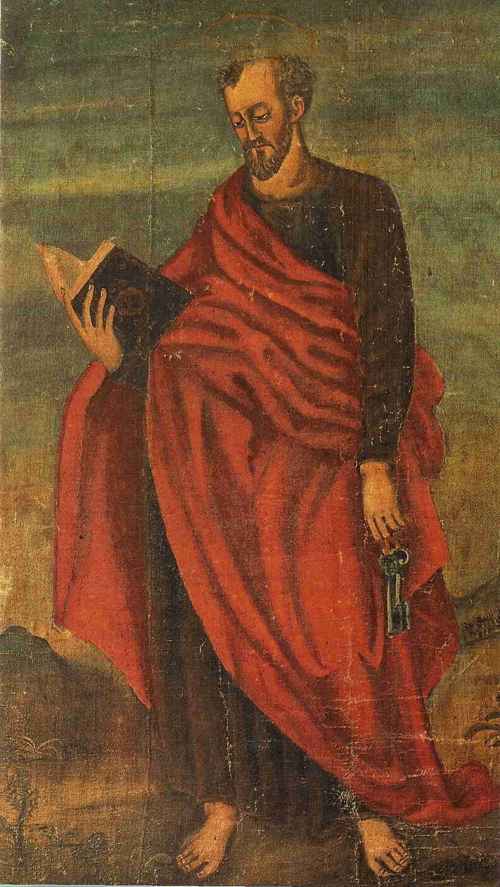 Inevitably depictions of the Holy Family and saints were included, here Saint Peter, rendered in oil paint on cloth. A few other works from this period are known to have used oil paints, and some used conventional Western canvas supports. Written records state that Western painting using oils and watercolours was taught in schools in the missions, and there was print-making using copperplate etching too. A few of those prints have survived.