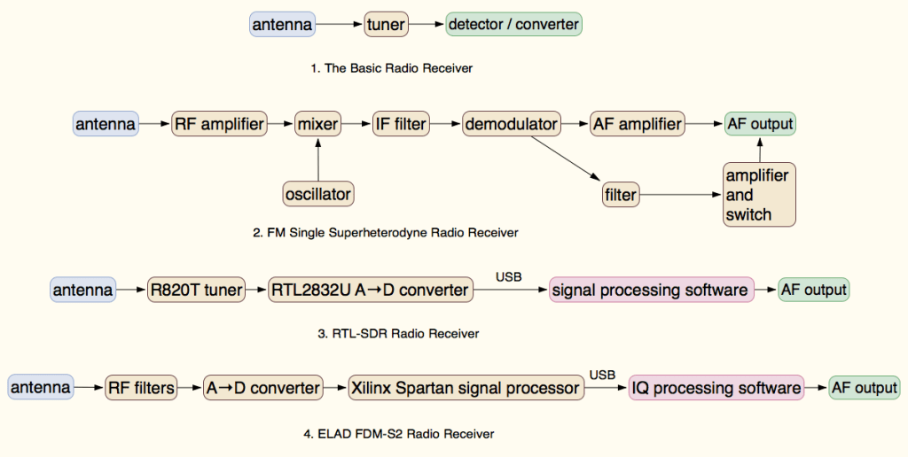 The most basic form of SDR is illustrated by the RTL device (item 3 in the diagram), which has an R820T chip to tune (select) the RF signal from the antenna and convert it to an intermediate frequency (IF), and the RTL2832U chip to convert that from analogue to 8-bit digital, and stream the digital data over USB to a computer. Software running on the computer then processes the signal, generating audio for output.
