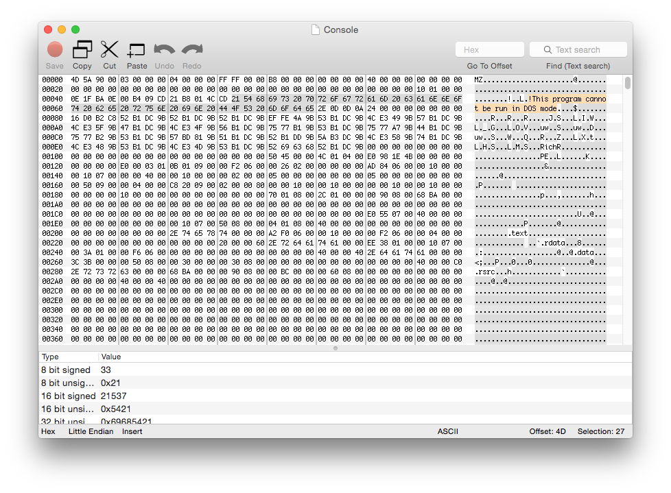 1 Save and open. Before trying to unscramble an attached or downloaded file, save it to its own folder, and save a copy in case that becomes altered. Then try double-clicking the file in the Finder, to see which default application opens it. Here a Windows executable has been opened in a hex file editor, revealing that it was probably compressed using PKZip for Windows.