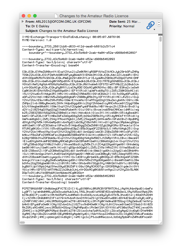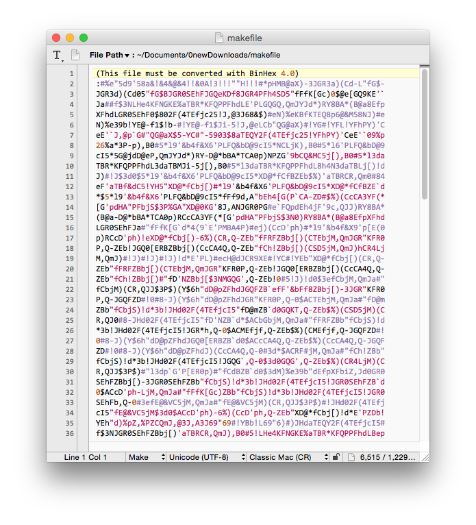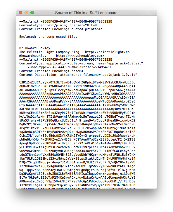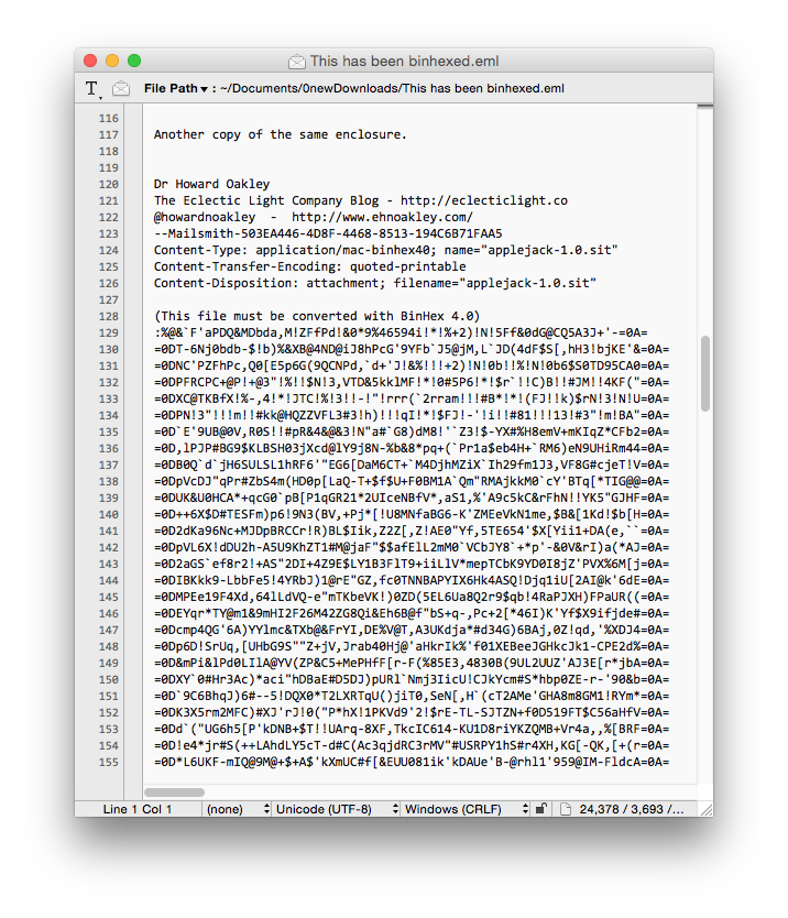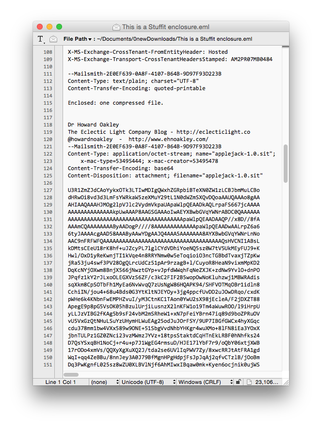 11 Convert text. Open the source in a text editor such as TextWrangler or BBEdit: shown above is a BinHex encoded file, and one using the more common Base64 encoding. Chop the top and foot of the text to leave the encoded content, then Save As a different file, but in plain text format to retain the original copy of the email. Decode and decompress the edited source using Stuffit Expander (App Store, free) or similar.