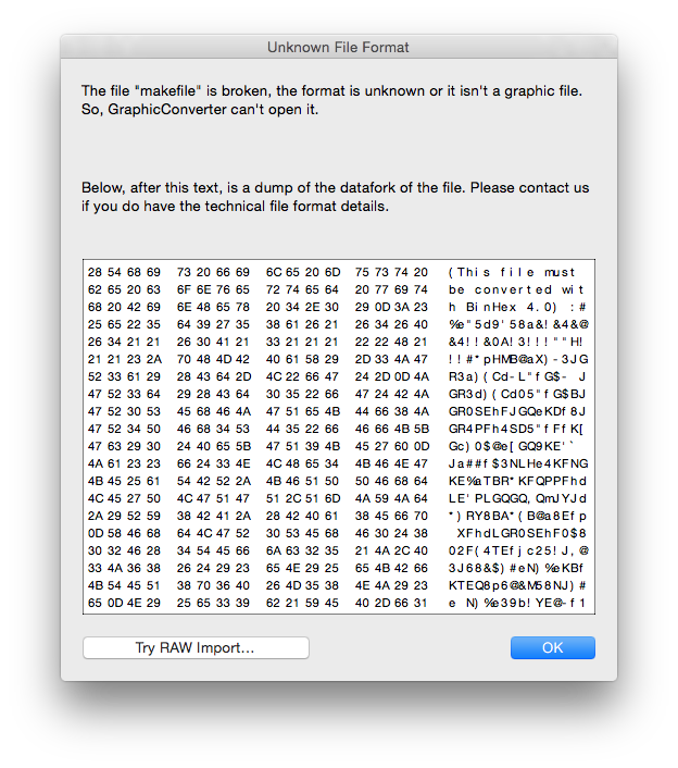 7 Use clues. If GraphicConverter decides that it cannot recognise the file format, and thus cannot open it, it will display the start of the file in hexadecimal values and in text. This may give you further clues as to the nature of the image. Click on the Try RAW Import button if you think that worth a shot. Otherwise you may need to return to your mail or browser.