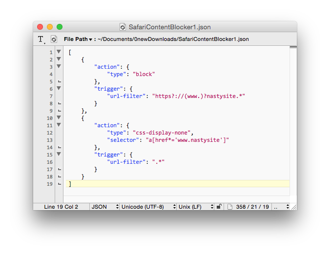 Each rule in the blocker consists of an action and trigger pair, in which the trigger specifies the page content which will trigger the action by Safari. In the above, Safari (or actually WebKit within Safari) will filter URLs so that any which match the regular expression