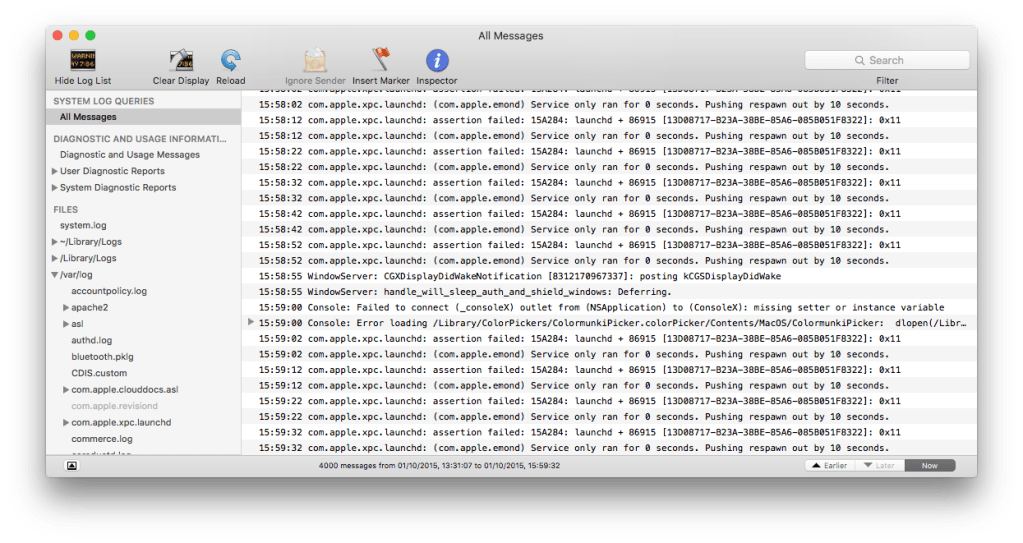 01/10/2015 18:12:07.089 com.apple.xpc.launchd[1]: (com.apple.emond) Service only ran for 0 seconds. Pushing respawn out by 10 seconds.