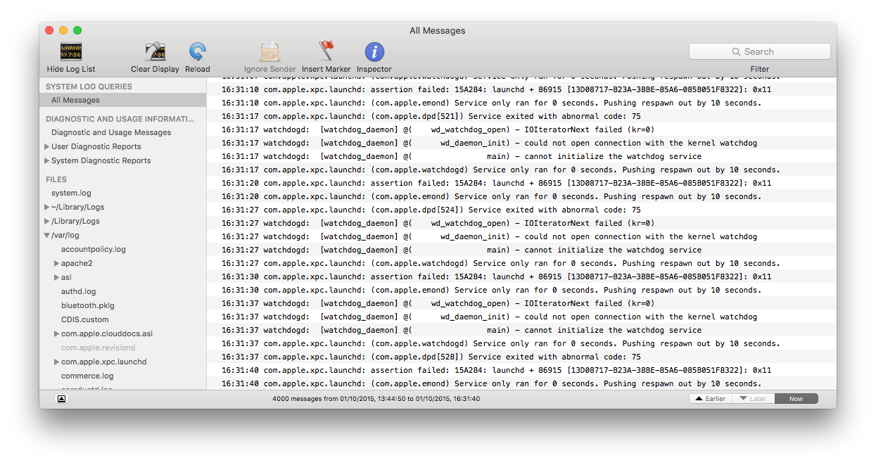 Again, I left my Mac a few minutes to let all the startup hullabaloo settle, then opened Console. Because you are in Safe mode, error reporting should now be more verbose, providing more info to help you track that cause. Sure enough launchd was still locked in its futile loop, but now the error messages revealed where the problem was arising: in the watchdog service, watchdogd. This is very much part of OS X, although it could be upset by third-party extensions or daemons.