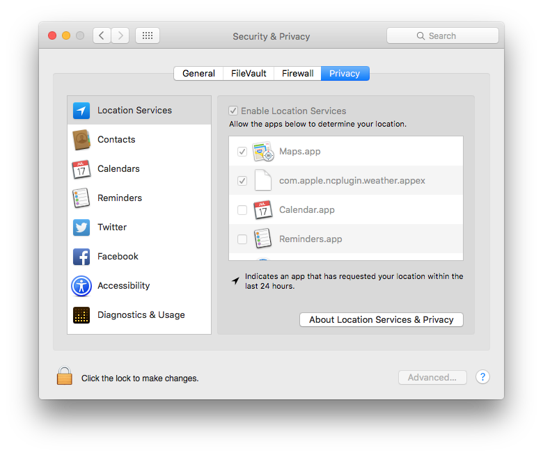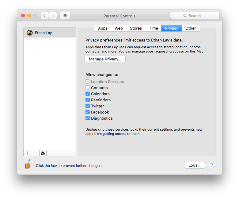 8. Manage privacy settings. Click on the Privacy tab to set which apps will have access to their personal data. Services which are left unchecked will be locked away from apps, ensuring your child’s privacy. Click the Manage Privacy… button at the top to switch to the Security & Privacy pane for your child’s account.