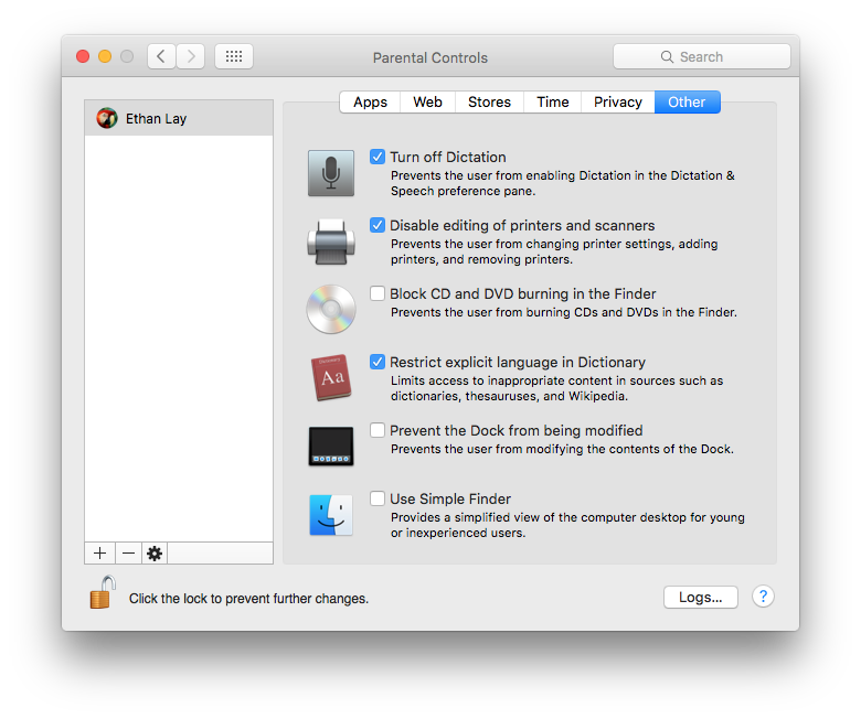 10. Set miscellaneous controls. Click on the Other tab to complete setting up Parental Controls. Most of these are simple and self-explanatory. This is where you can now opt for your child to use the Simple Finder, which is intended for younger children. If you want to hide ‘naughty’ words in the system dictionary you can check the box here, but third party applications which use their own dictionaries may be unaffected.