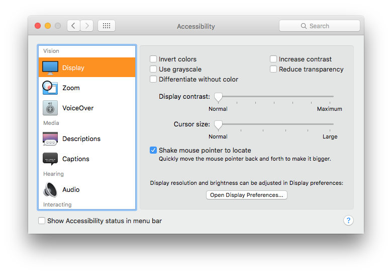 The Accessibility pane offers control over cursor size: one important feature in more recent releases of OS X is that you can ‘shake’ the pointer/cursor to enlarge it, restoring its visibility.