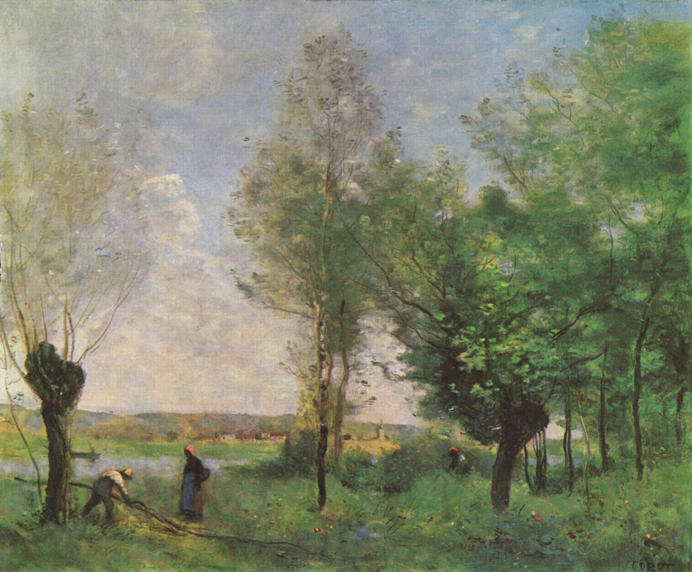 Corot was a central figure in the development of painting in the nineteenth century. He learned the tradition which had originated with Claude Lorraine and Nicolas Poussin, and was augmented by the development of plein air oil sketching in the eighteenth century. As he was becoming established, Constable’s landscapes were making a great impression in France, and undoubtedly influenced him.