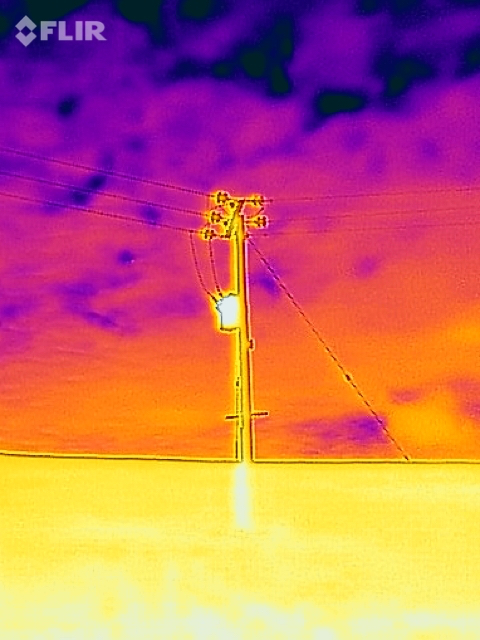 Here the transformer mounted halfway up the poles is clearly warm, as it generates heat when stepping the supply voltage down for delivery to a nearby building. Of greater interest to the line checker is the temperature of the glass or ceramic insulators at the top of the installation: if one cracks or starts to fail, that insulator will appear significantly warmer than the others, and can be replaced before it shorts out completely.