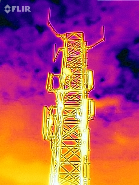 The warmest elements are antennae, which warm with the radiofrequency (RF) being applied to them. The tower itself has warmed passively under the overcast sky, which in turn is the coolest part of the picture.