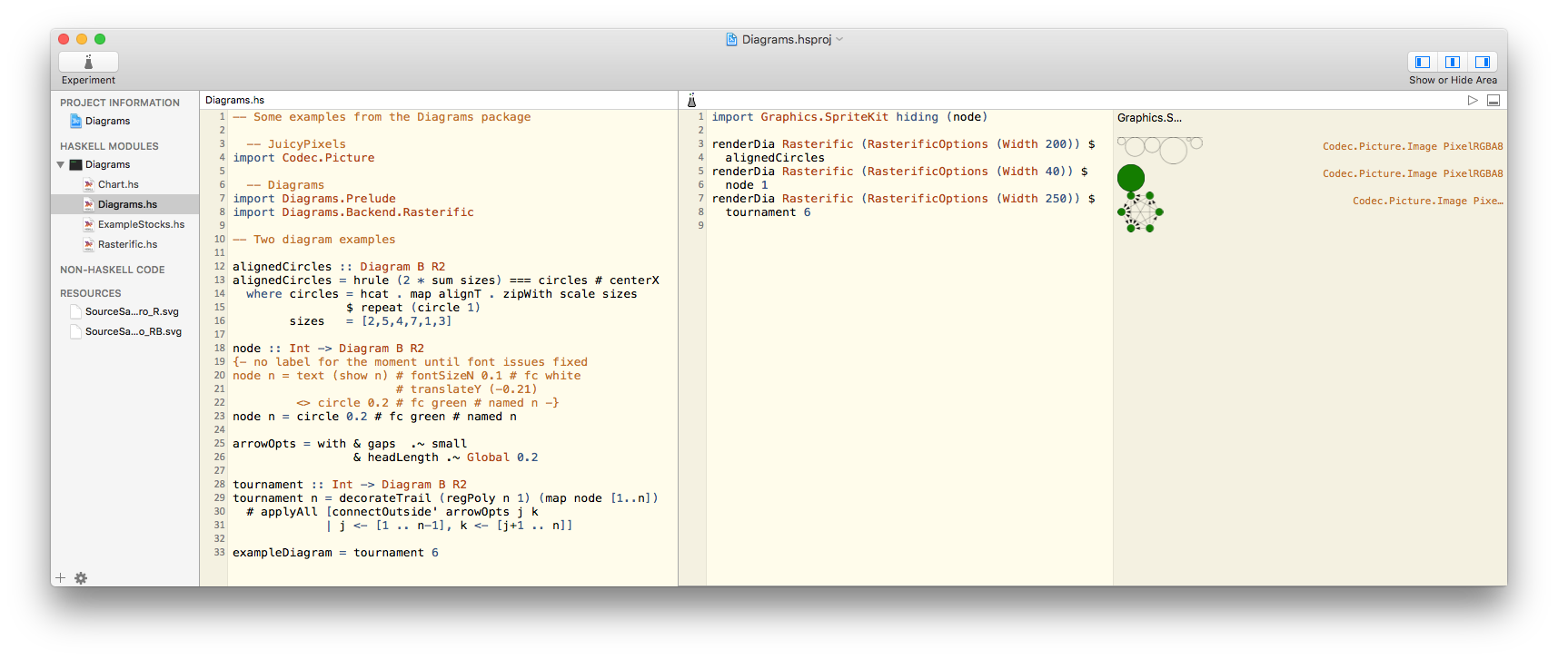 Among the library modules provided in this new and very sleek SDK is Language.C.Inline.ObjC, in the language-c-inline package. This supports making inline Objective-C calls from Haskell, and there is another bundled module Graphics.SpriteKit.